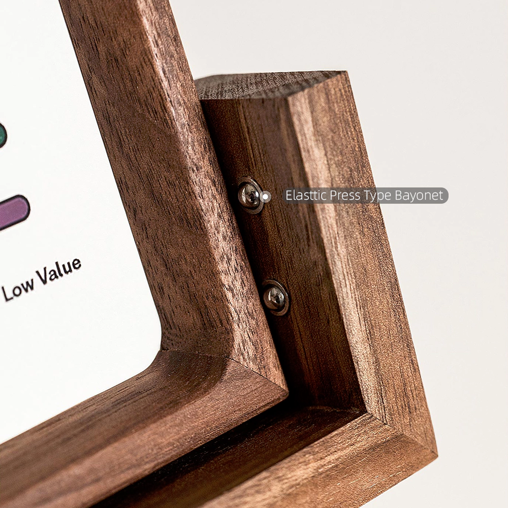 The wooden TV photo frame adopts a traditional mortise and tenon joint method, and the frame does not use a single screw. The photo frame can be used alone, and the back is equipped with a solid support rod, which can be vertically and horizontally swung.