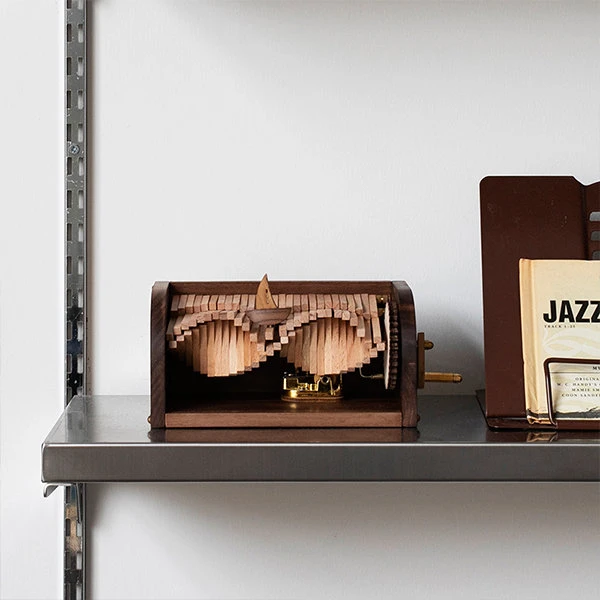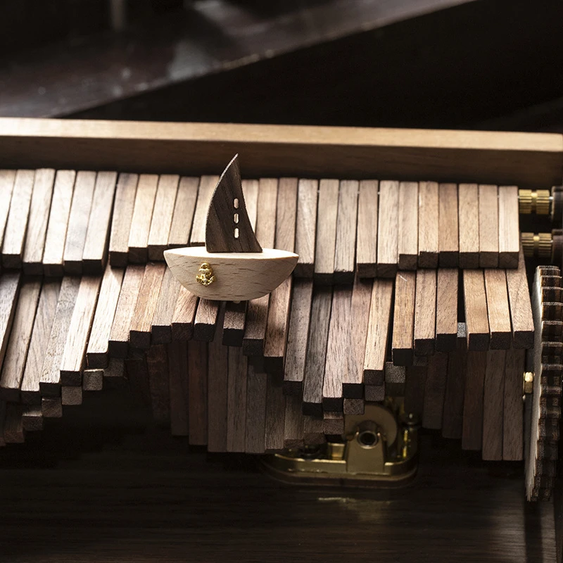 The music box takes on the design of waves, and features a little boat on the waves. Made from a combination of black walnut and beech wood, this lovely music box is simply lovely.